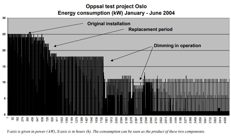 Ce graphique représentant le projet d’essai qui a été réalisé à Oslo en 2004 permet de constater que de nombreuses économies énergétiques peuvent être réalisées avec ce travail de système intelligent. De plus, en adaptant dynamiquement l’intensité lumineuse en fonction des besoins, la sécurité routière est améliorée, créant un environnement plus sûr pour les piétons et les conducteurs. L’introduction de l’éclairage public intelligent apporte encore d’autres avantages. Il peut également s’intégrer dans les systèmes de contrôle des villes. Par exemple, l’éclairage public peut être réduit pendant les heures d’ouverture des magasins et être augmenté après leur fermeture.